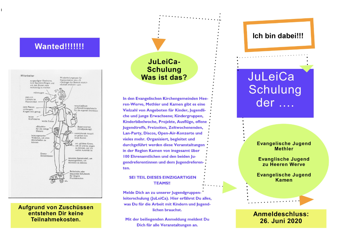 Nach absolvierter theoretischer Ausbildung und praktischem Einsatz in der Kinder- und Jugendarbeit vor Ort kann dann die JuLeiCA- die Jugend- Leiter- Card online beantragt werden. Sie ist die bundesweit anerkannte Form einer ehrenamtlichen, qualifizierten Mitarbeiterausbildung und Voraussetzung für die Mitarbeit in der Ev. Jugend von Westfalen und deren Angeboten. An einigen öffentlichen Stellen können mit der JuleiCa- Vergünstigungen erworben werden. Nachfragen lohnt sich!